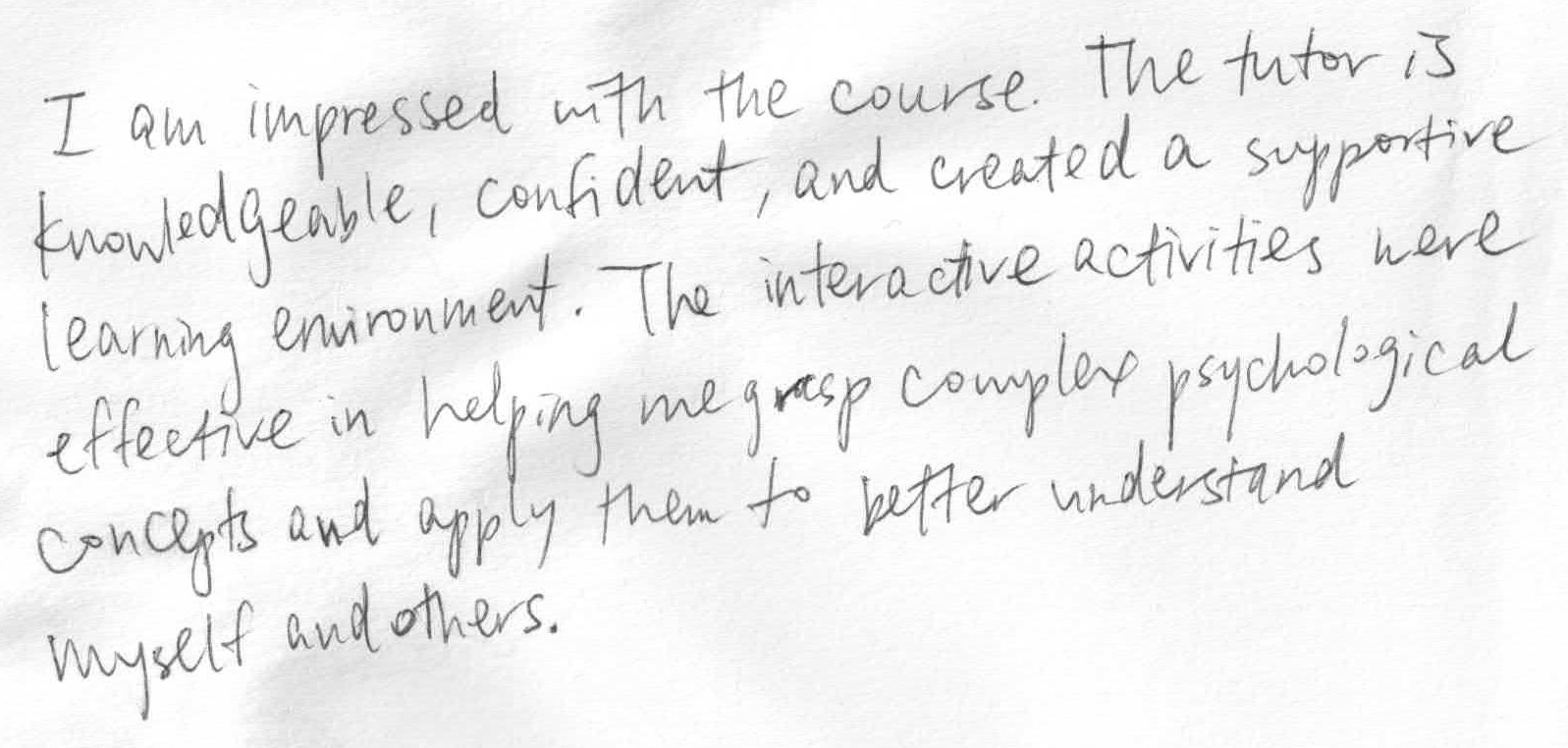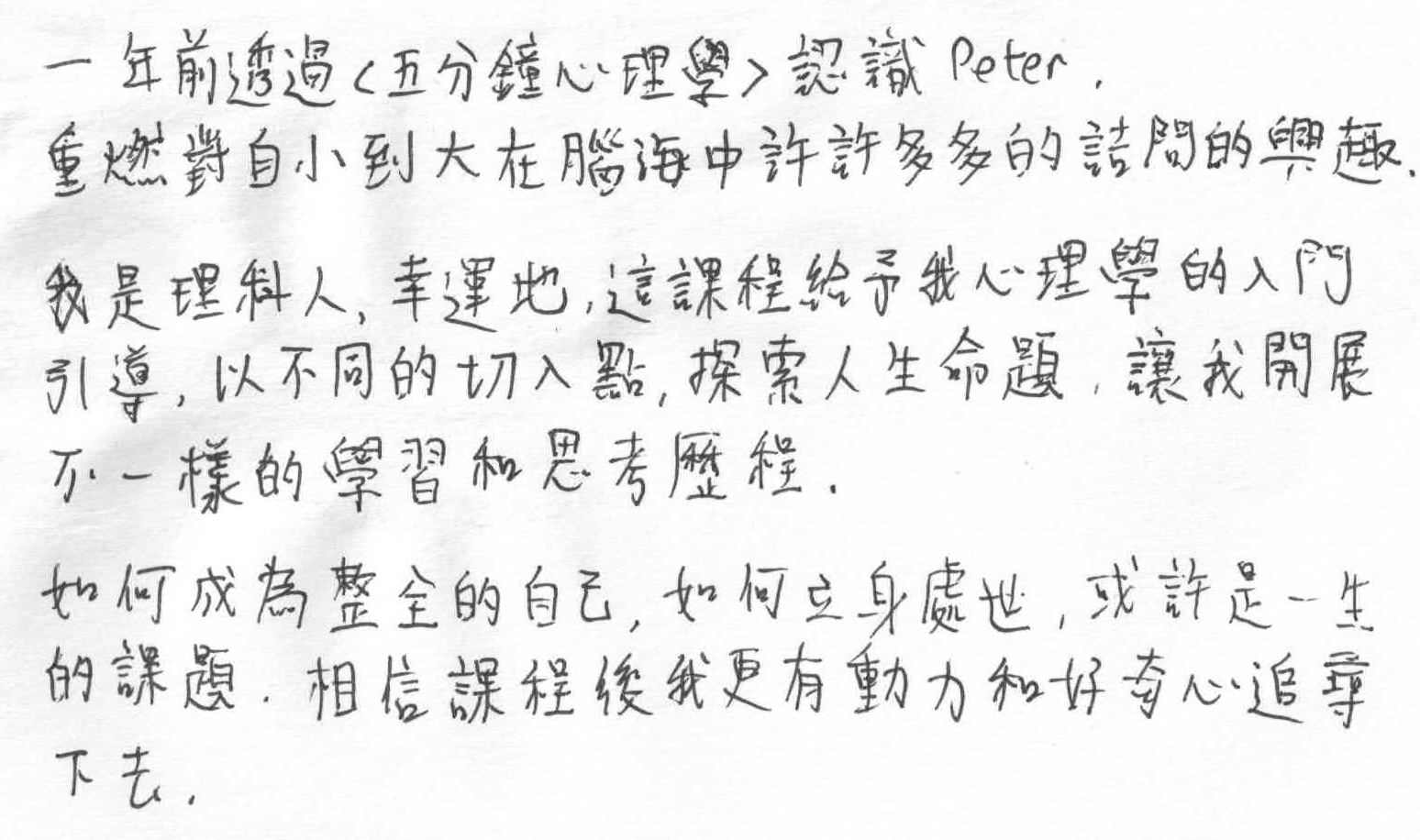 「心理學是冷冰的科學,亦是溫暖的人文關懷。唯有將兩者融會貫通,才算全面的了解心理學。」